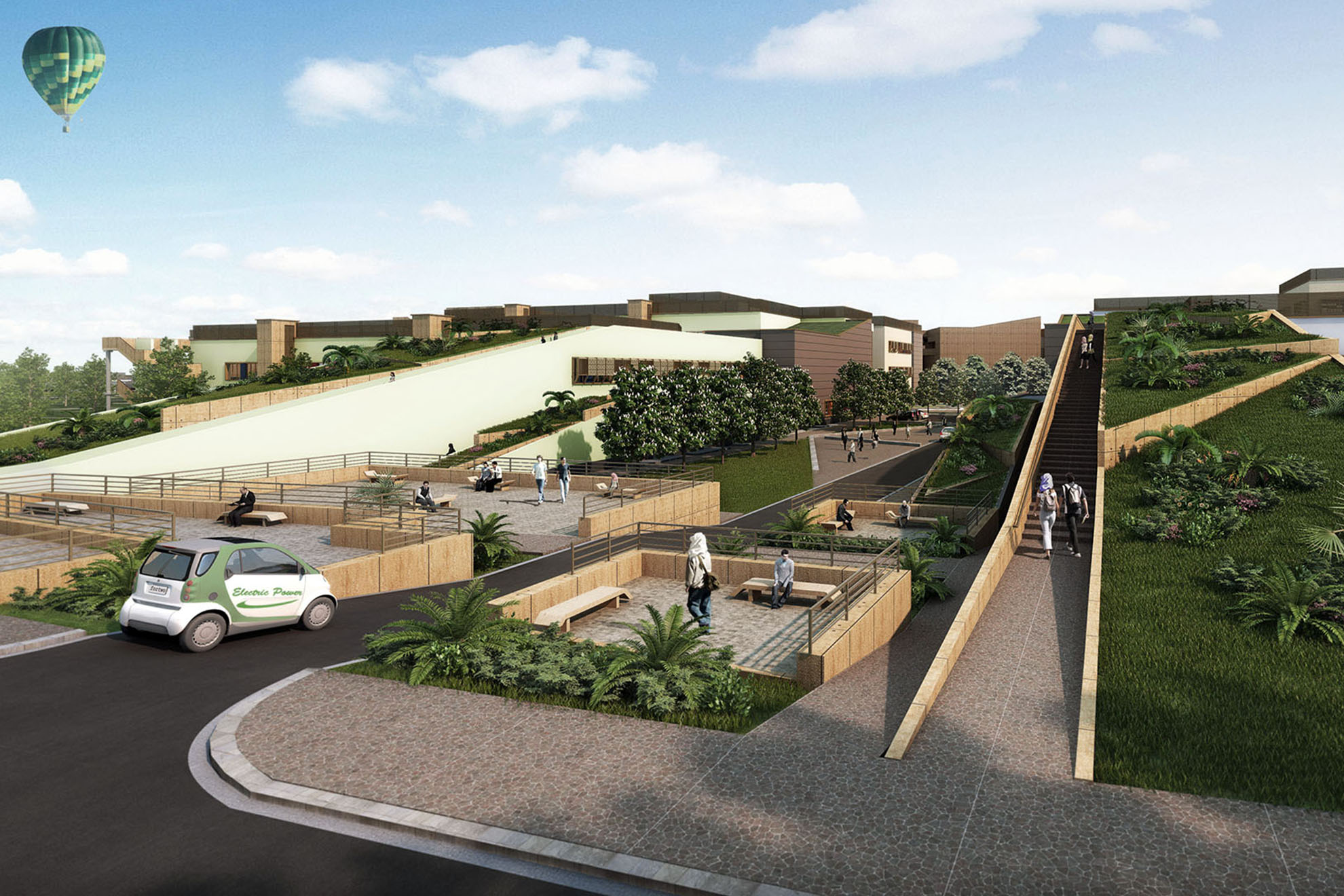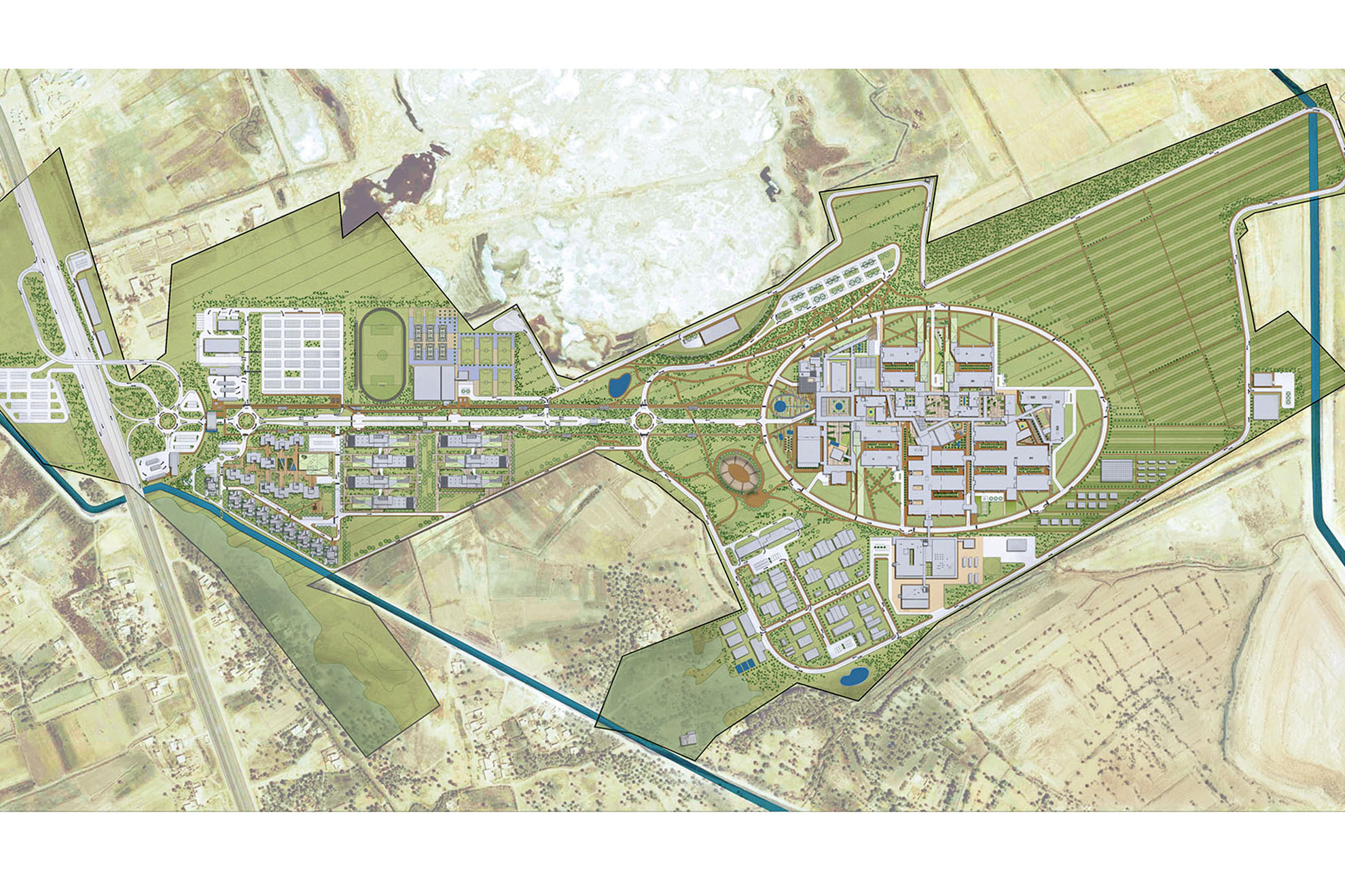 The masterplan is organized like an ancient town, with a central square and an elliptical infrastructure ring defining the academic core across multiple levels, ensuring connectivity and shaded pedestrian paths. Architecture references local heritage through brick façades inspired by Babylonian construction and modernist concrete elements. The design preserves the existing terrain and integrates renewable energy, electric mobility, and resource-efficient strategies to achieve high environmental performance.
