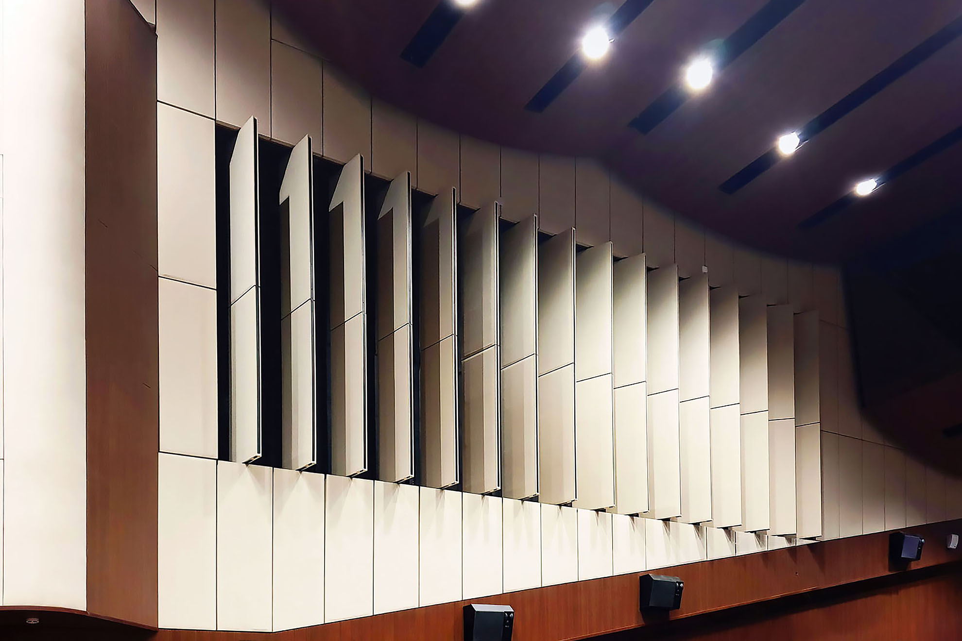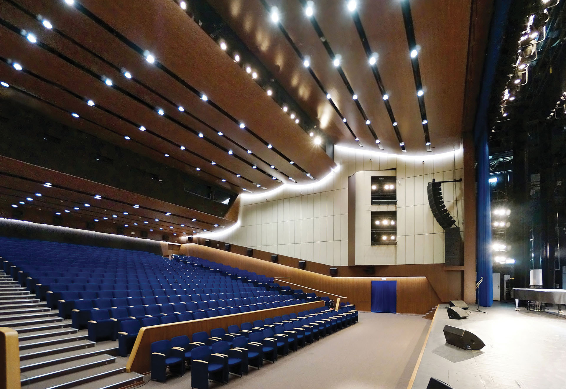 Paolo Lettieri has been appointed to have an auditorium acoustically performed both as a cinema and as a concert hall and for a modern aesthetic design. The project has an innovative system of acoustic revolving paneling digitally controlled by sensors and dedicated software to change the acoustic configuration of the hall, designed in cooperation with Ing. Brugola. The organic shape of ceiling is developed for best possible acoustic refraction. The curved suspended ceiling was designed and built with Topakustik panels mounted on curved steel ribs with a fixed geometry of 5m radius.