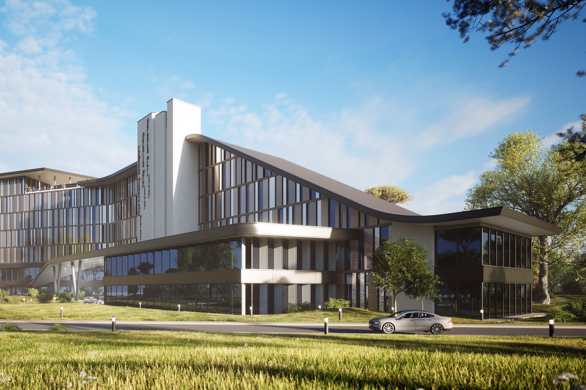 The hotel’s curvilinear layout follows the natural contours of the shoreline, translating sinuous forms from plan into three-dimensional architecture. Soft, folded planes shape the roofs and solid volumes, while extensive glazing defines the vertical enclosures, enhancing transparency and lightness. The entrance façade features a rhythmic mix of glass and opaque panels, punctuated by solid vertical cores for circulation. Lakefront terraces emphasize horizontal lines with undulating parapets and varied transparency. A low pavilion opens onto the pool area, and the entire complex integrates with the surrounding park through continuous, ground-emerging curved planes, reinforcing a seamless relationship between architecture and landscape.