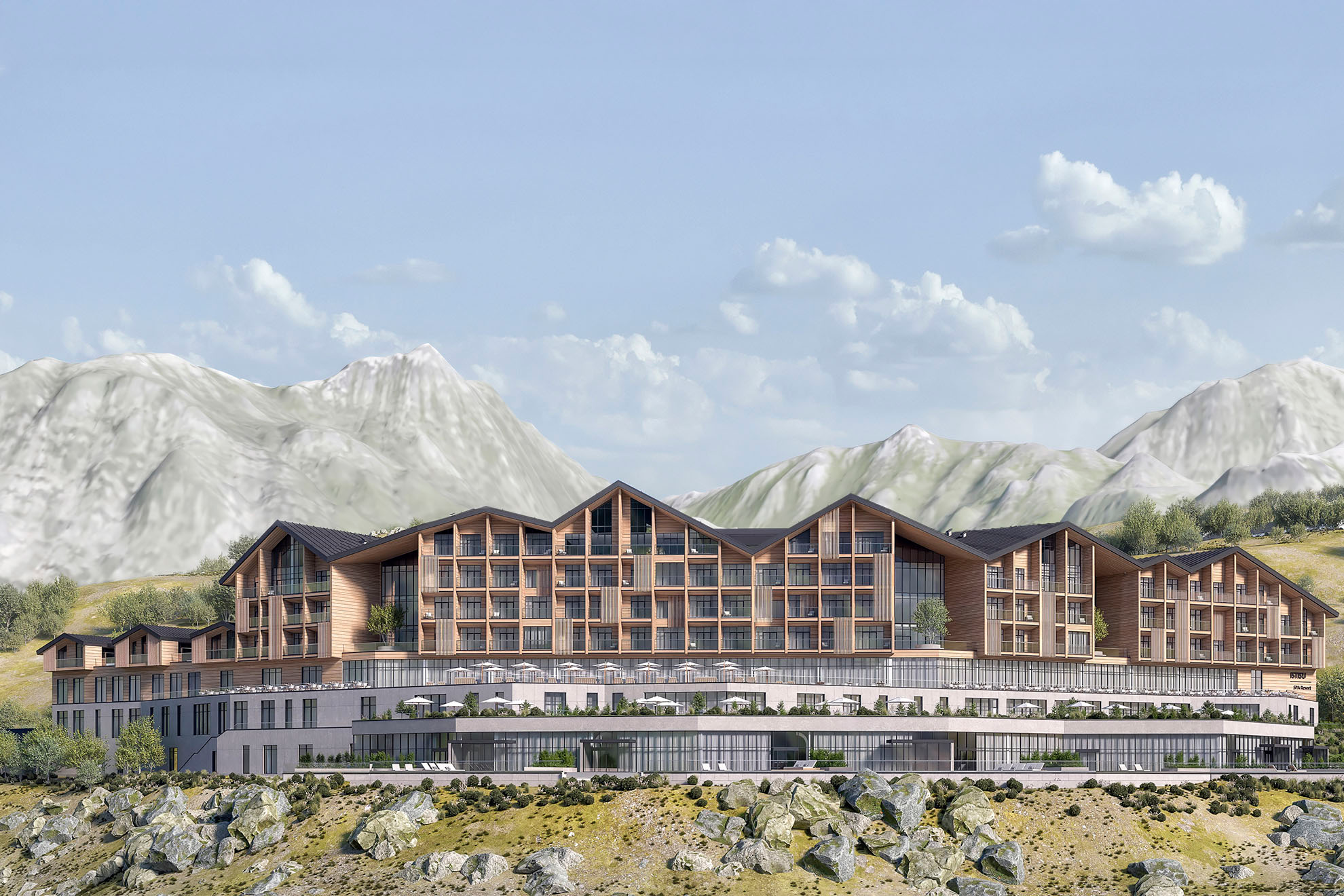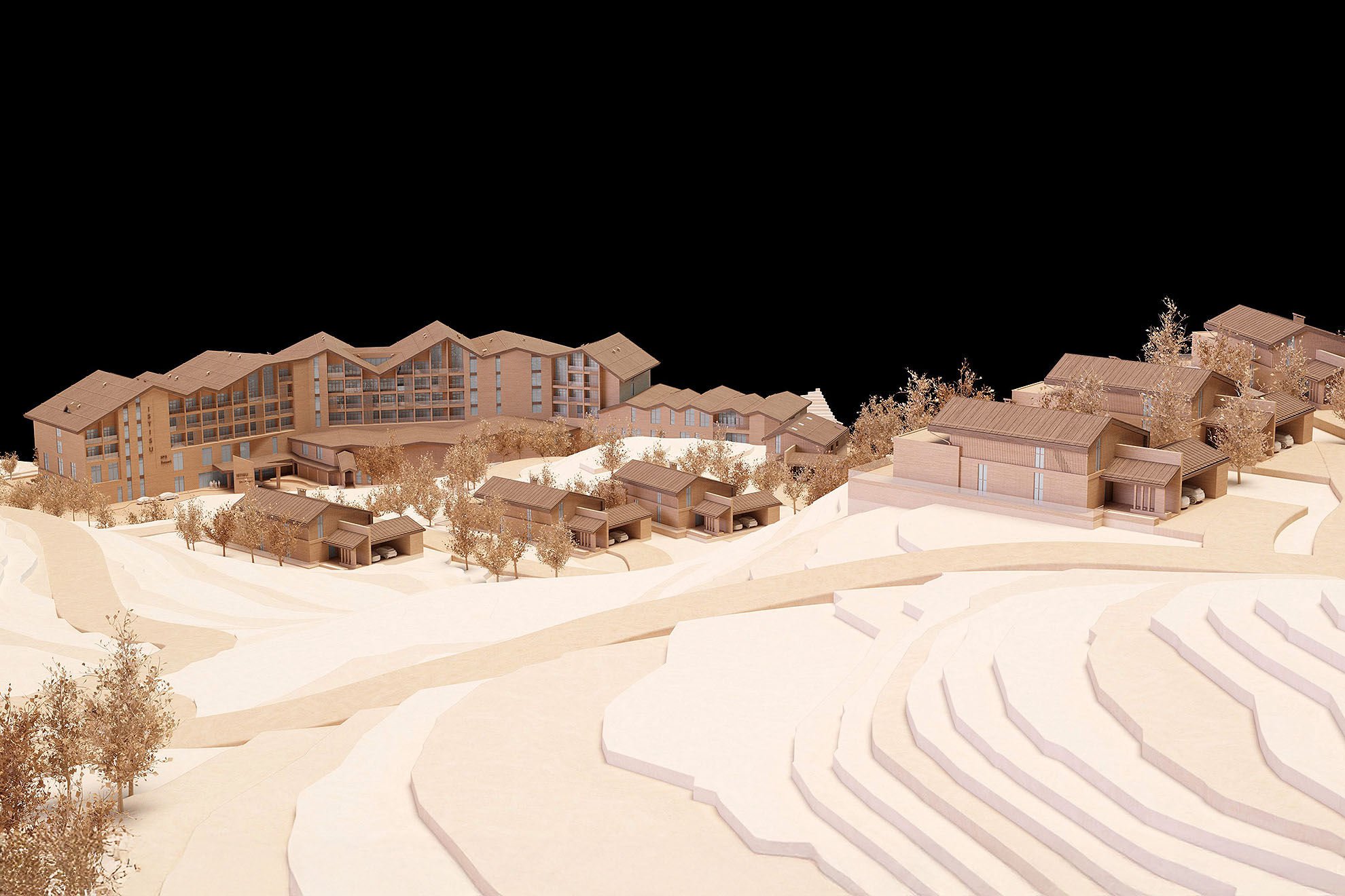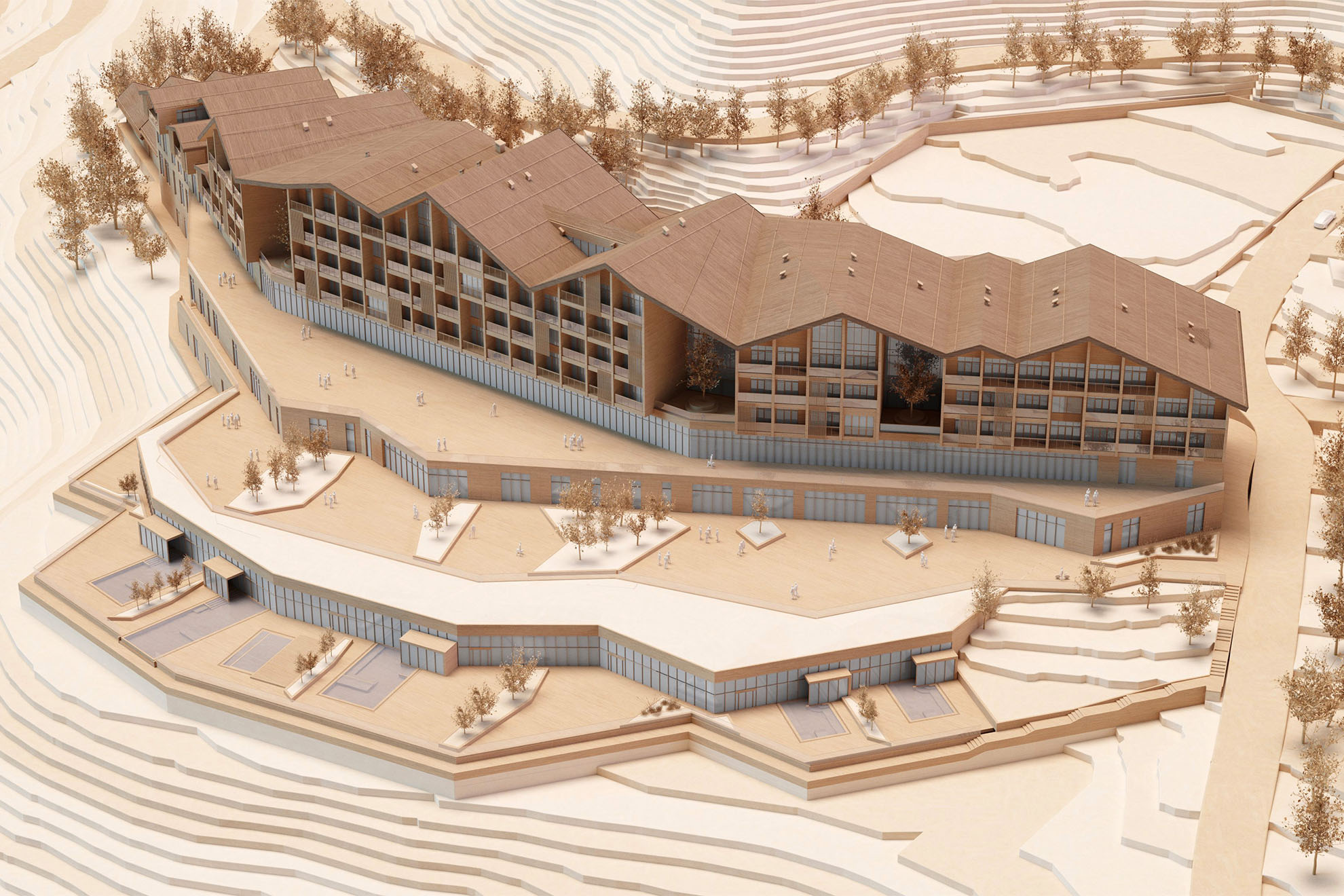 The masterplan prioritizes environmental integration, reusing the footprint of a former Soviet sanatorium and following existing roads to minimize landscape impact. An organic design language shapes both the layout and architecture: the hotel’s asymmetrical profile echoes the surrounding mountains, villas ensure privacy and valley views, and staff housing is naturally screened. Materials such as wood and stone reinterpret traditional alpine construction through contemporary technologies.